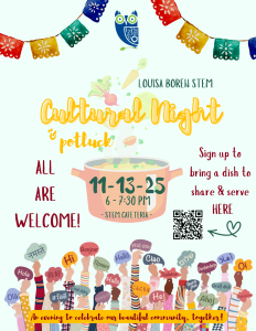 An evening to celebrate our beautiful community together, with a potluck! Sign up to bring a dish to share and serve at Cultural Night here!
