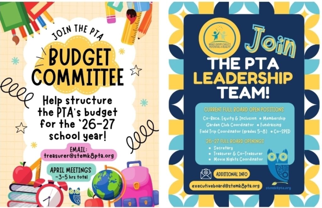 We’re looking for participants for our annual Budget Committee to help structure the PTA’s financial support for STEM for the ’26-27 school year. Meetings will take place in April with a 3-5 hour estimated total commitment. Please reach out to treasurer@stemk8pta.org for questions or interest!