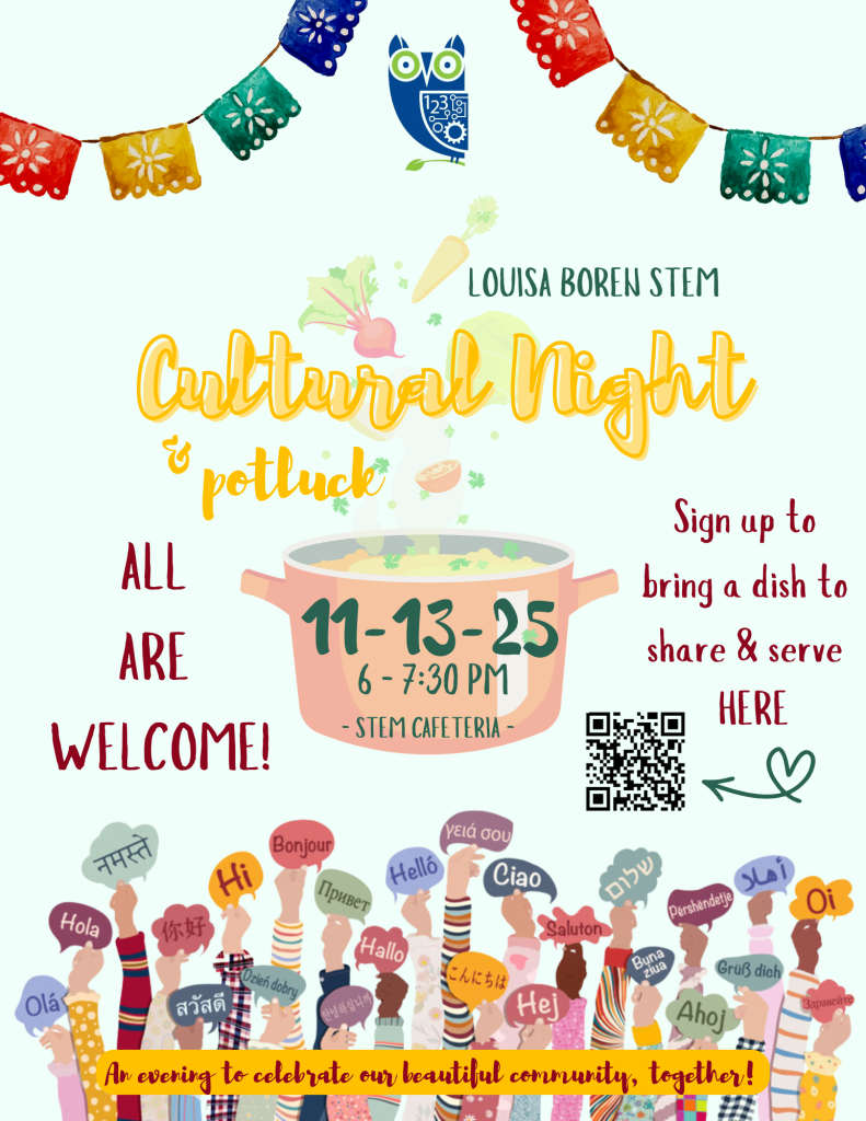 Cultural Night at STEM is an evening to celebrate our community, together, with a potluck! Sign up to bring an optional dish to share and serve at Cultural Night here. All are welcome- hope to see you there Owls!