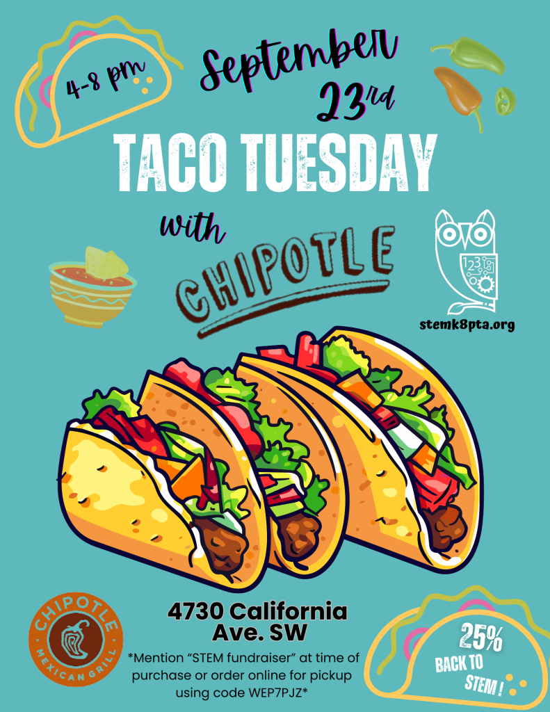 Taco Tuesday with Chipotle is this Tuesday, 9/23 from 4-8 pm. Order between 4-8 pm and 25% will go directly back to our PTA! Mention “STEM fundraiser” or use online code “WEP7PJZ” at time of purchase. *This location ONLY: 4730 California Ave. SW