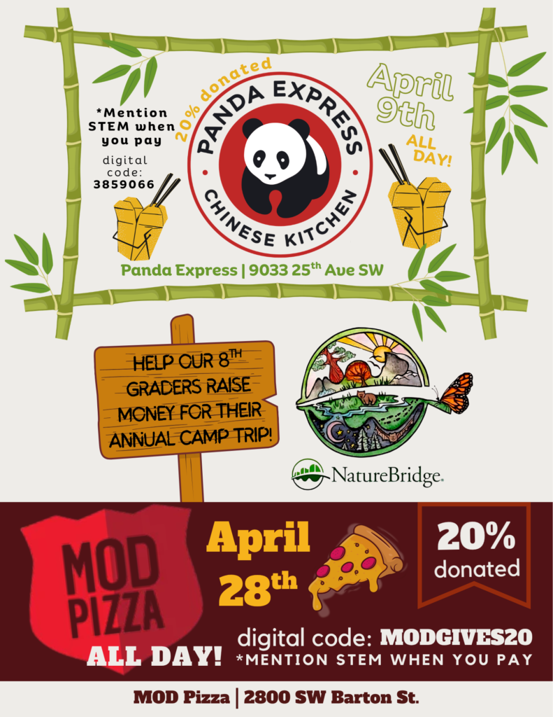- Panda Express: Thursday, April 9th – All day! – Mention Louisa Boren STEM at time of purchase (digital code: 3859066) – 20% donated – Panda Express: 9033 25th Ave SW