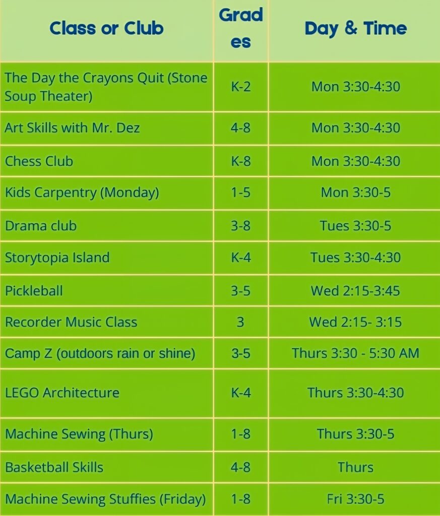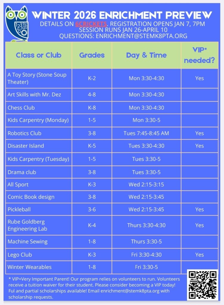 Fees are associated with the classes/clubs; scholarships available. Email enrichment@stemk8pta.org for financial assistance.