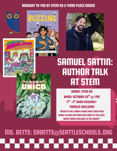 Author Samuel Sattin will be visiting STEM October 20th @ 1 pm, during the 3rd-8th grade assembly. Families are welcome to join!