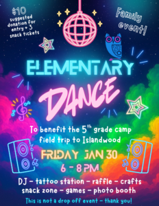 Join us to raise funds so that ALL of our 5th graders have the opportunity to participate in the annual camp field trip to Islandwood, with a family dance! Many fun activities planned for this evening to help continue our outdoor education tradition at STEM. $10 suggested donation per student for entry + 3 snack tickets. All are welcome!