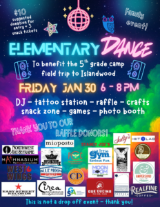 Please join us to raise funds so that ALL of our 5th graders have the opportunity to participate in the annual camp field trip to Islandwood, with a family dance & raffle! Many fun activities planned for this evening to help continue our outdoor education tradition at STEM. See raffle prizes below! $10 suggested donation per student for entry + 3 snack tickets, or pay what works for your family. All are welcome!