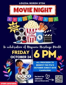 Our first Movie Night of the year is Friday, October 24! Join us in celebration of Hispanic Heritage Month to watch Coco! $5-$10 suggested donation for entry + snacks. All proceeds will benefit the PTA’s October Direct Give campaign. Hope to see you there!