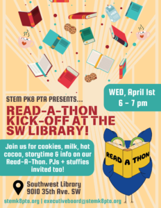 Join us at the Southwest Library Branch for storytime, cookies, milk, hot cocoa and details about our big Spring fundraiser, Read-A-Thon! PJs + stuffies invited too! Please reach out to executiveboard@stemk8pta.org for questions or to join the R-A-T team!