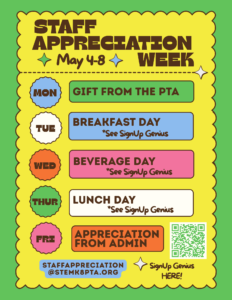 We love our STEM Staff!! Help celebrate them with yummy food and treats all week long! Several themed days planned- see SignUp Genius to participate.