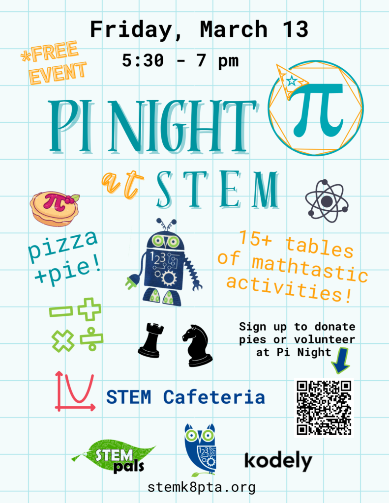 We’re excited for the return of our annual Pi Night, a FREE community event to celebrate International Pi Day! STEM Pals, Kodely, STEM Bots, tons more math fun + pizza and pie!!