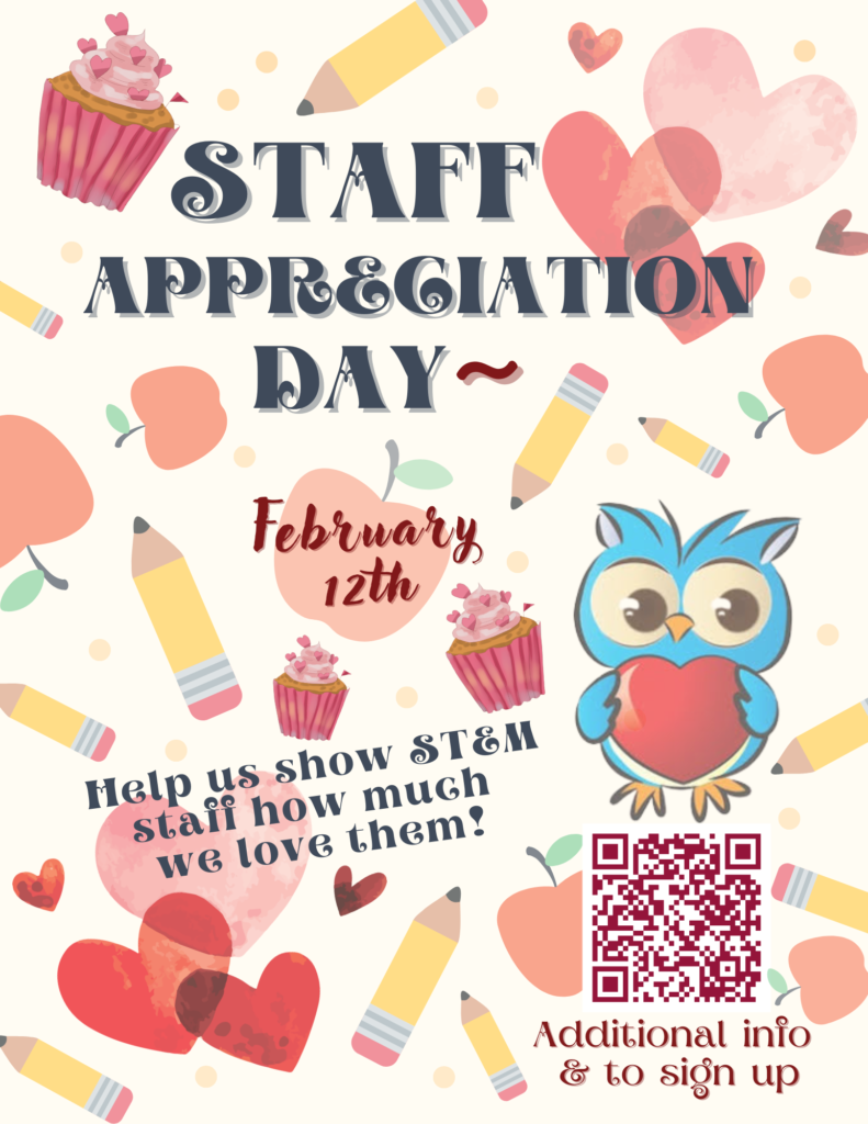 Staff Appreciation is Wednesday, February 12: Help us to show our wonderful STEM staff how much we love them, with yummy food and treats! See HERE for additional info and to sign up for this event.