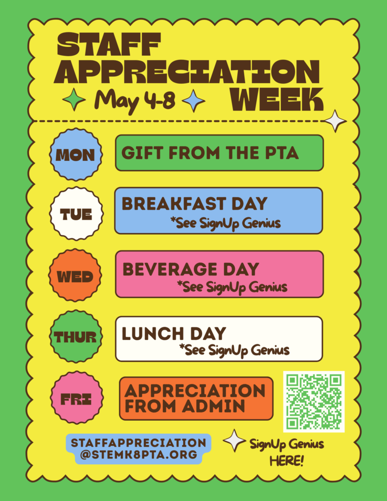 Several themed days planned, please check the SignUpGenius for details and to sign up! Personal notes to the staff who work closely with your children are greatly appreciated at any time.