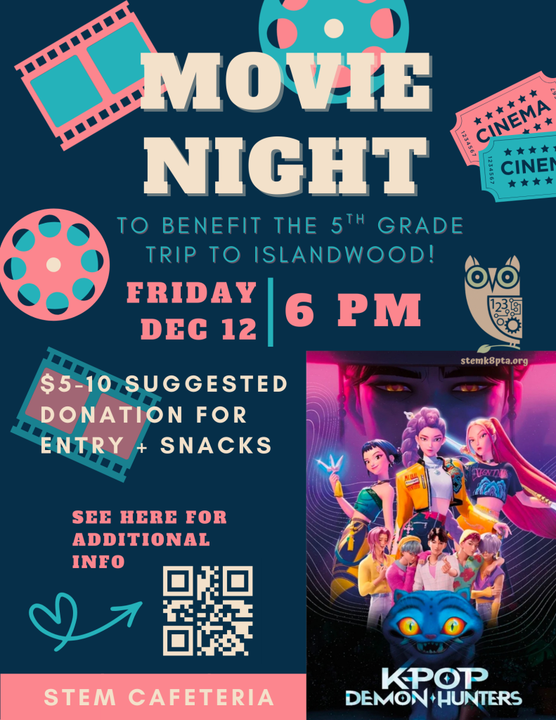 Movie Night is This Friday 12/12 @ 6 pm to benefit the 5th grade overnight camp trip to Islandwood in the Spring! Suggested donation of $5-10 for entry + snacks. See here for additional information.