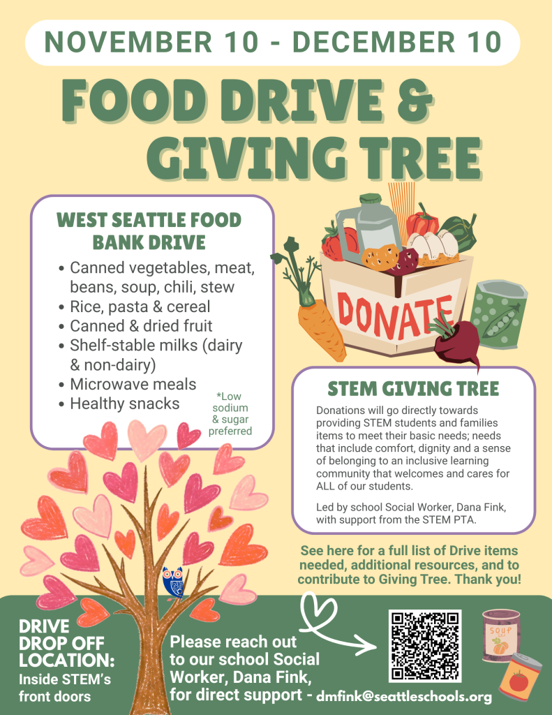 STEM is hosting a food drive for the West Seattle Food Bank starting Monday, November 10! Drop off bin will be located just inside the front doors of STEM. Please see here for additional details on items needed right now. Thank you!